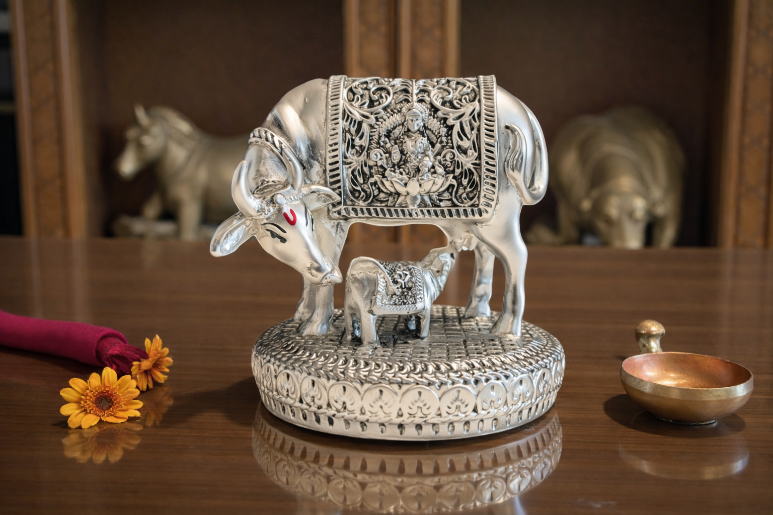 Expertly crafted with intricate detailing and a refined luxury finish, this Kamadhenu idol enhances home temples, pooja rooms, living spaces, offices, and elegant interiors with serene divinity and timeless beauty. The gentle posture and expressive form reflect devotion blended with artistic excellence, making it both a sacred symbol and a statement of refined décor.