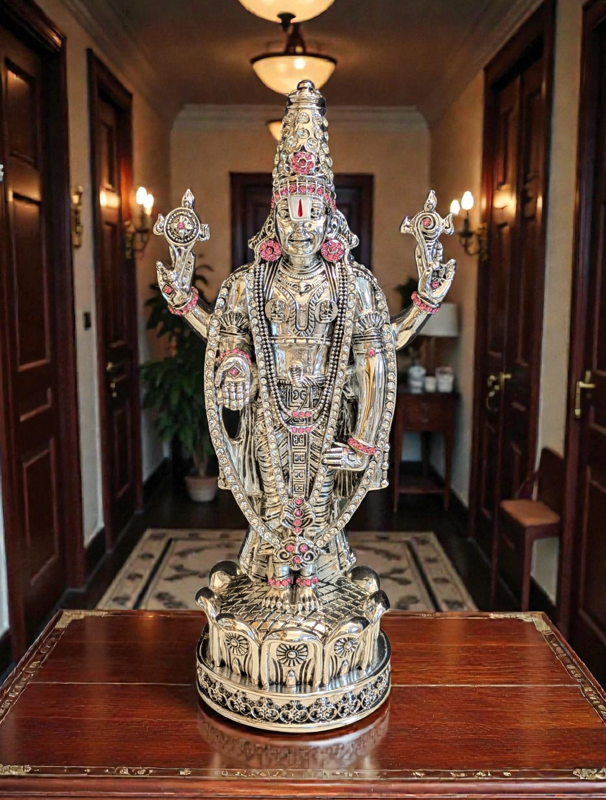 Tirupati Balaji – Royale is a majestic representation of Lord Venkateswara, the supreme giver of prosperity, protection, and divine fulfillment. Inspired by the sacred deity of Tirumala, this royal idol embodies spiritual power wrapped in timeless elegance and refined craftsmanship.
