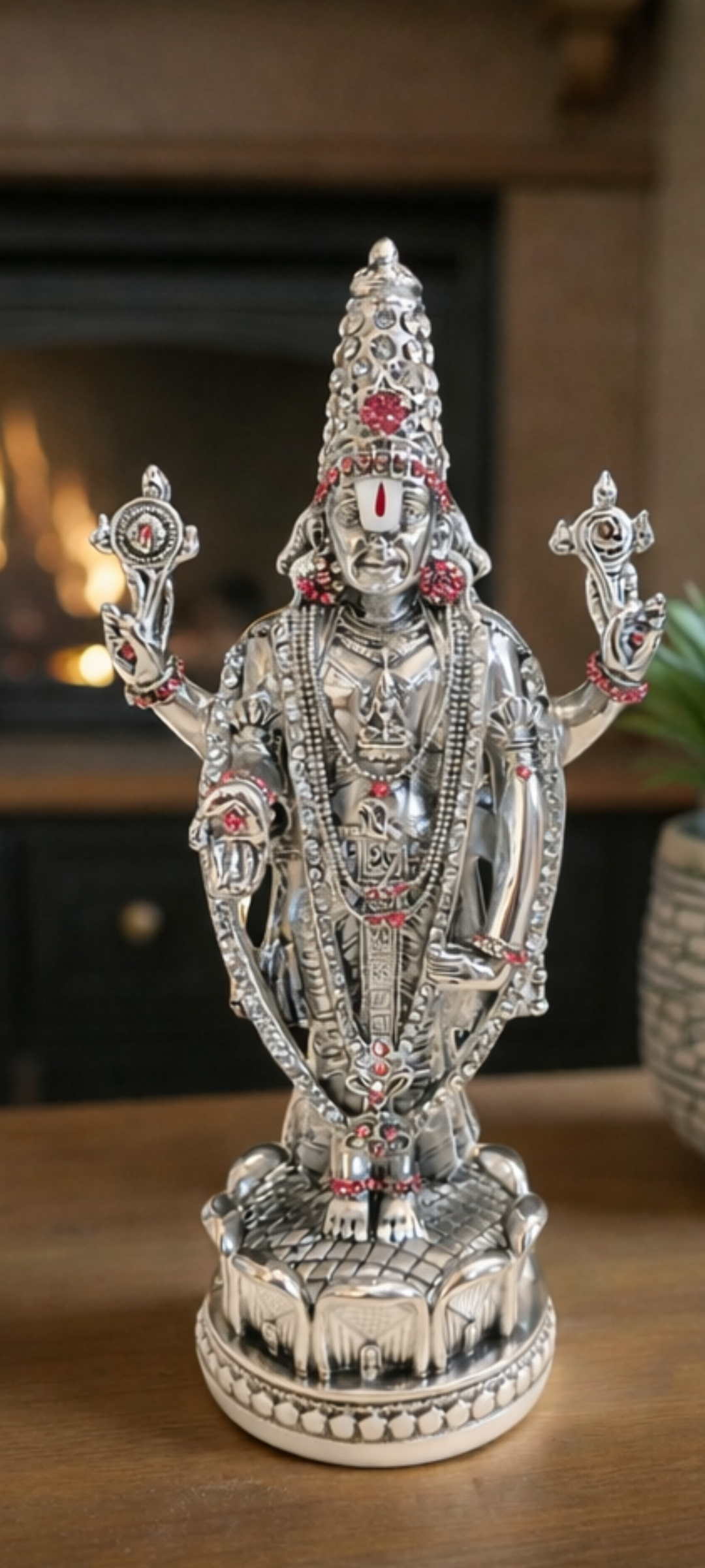 Tirupati Balaji – Royale is a majestic representation of Lord Venkateswara, the supreme giver of prosperity, protection, and divine fulfillment. Inspired by the sacred deity of Tirumala, this royal idol embodies spiritual power wrapped in timeless elegance and refined craftsmanship.