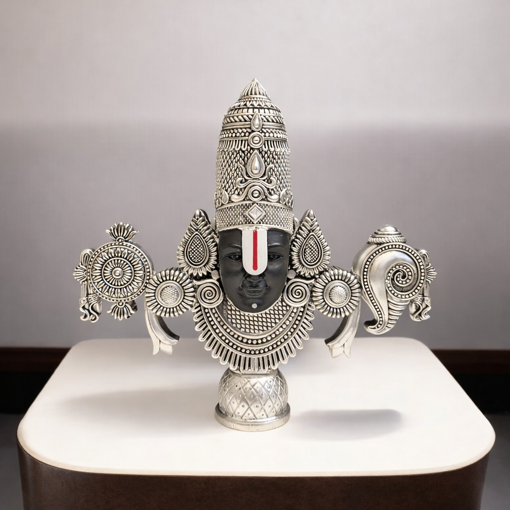 Meticulously designed with intricate ornamentation and a rich silver-toned luxury finish, this premium Balaji idol enhances home temples, pooja rooms, living spaces, offices, and luxury interiors with timeless grace. The detailed crown, sacred namam, and divine expression reflect exceptional craftsmanship and devotional depth, making it both a spiritual symbol and a statement of refined décor.